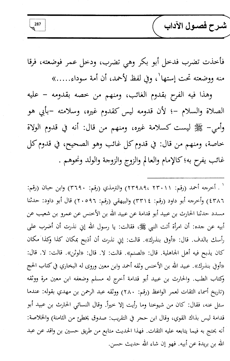 (¬1) أخرجه أحمد (رقم: 23011،23989) والترمذي (رقم: 3690) وابن حبان (رقم: 4386) وأخرجه أبو داود (رقم: 3314) والبيهقي (رقم: 20596) قال أبو داود: حدثنا مسدد حدثنا الحارث بن عبيد أبو قدامة عن عبيد الله بن الأخنس عن عمرو بن شعيب عن أبيه عن جده: أن امرأة أتت النبي - صلى الله عليه وسلم -، فقالت: يا رسول الله إني نذرت أن أضرب على رأسك بالدف. قال: «أوفى بنذرك». قالت: إني نذرت أن أذبح بمكان كذا وكذا مكان كان يذبح فيه أهل الجاهلية. قال: «لصنم». قالت: لا. قال: «لوثن». قالت: لا. قال: «أوفي بنذرك». عبيد الله بن الأخنس وثقه أحمد وابن معين وروى له البخاري في كتاب الحج وكتاب الطب. والحارث بن عبيد أبو قدامة أخرج له مسلم وضعفه ابن معين مرة ووثقه (تاريخ أسماء الثقات لعمر الواعظ (رقم: 280) ووثقه عبد الرحمن بن مهدي بقوله: عندما سئل عنه، فقال: كان من شيوخنا وما رأيت إلا خيراً. وقال النسائي الحارث بن عبيد أبو قدامة ليس بذاك القوي، وقال ابن حجر في التقريب: صدوق يخطئ من الثامنة) والخلاصة: أنه يحتج به فيما يتابعه عليه الثقات. فهذا الحديث متابع من طريق حسين بن واقد عن عبد الله بن بريدة عن أبيه. فهو إن شاء الله حديث حسن.
