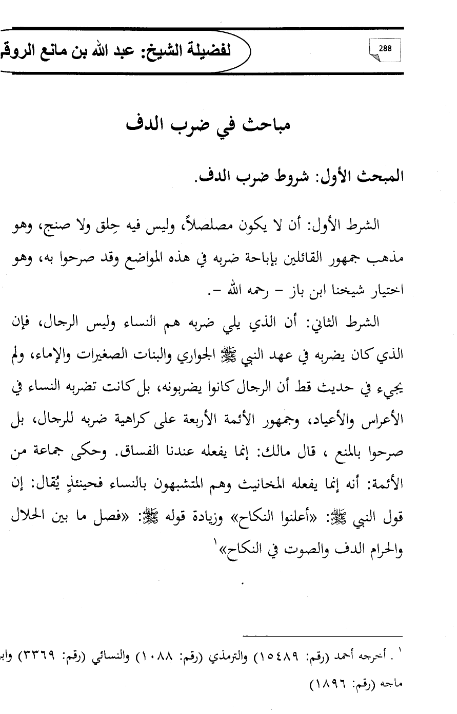 الشرط الثاني: أن الذي يلي ضربه هم النساء وليس الرجال, فإن الذي كان يضربه في عهد النبي - صلى الله عليه وسلم - الجواري والبنات الصغيرات والإماء, ولم يجيء في حديث قط أن الرجال كانوا يضربونه, بل كانت تضربه النساء في الأعراس والأعياد, وجمهور الأئمة الأربعة على كراهية ضربه للرجال, بل صرحوا بالمنع , قال مالك: إنما يفعله عندنا الفساق. وحكى جماعة من الأئمة: أنه إنما يفعله المخانيث وهم المتشبهون بالنساء فحينئذٍ يُقال: إن قول النبي - صلى الله عليه وسلم -: «أعلنوا النكاح» وزيادة قوله - صلى الله عليه وسلم -: «فصل ما بين الحلال والحرام الدف والصوت في النكاح» (¬1)