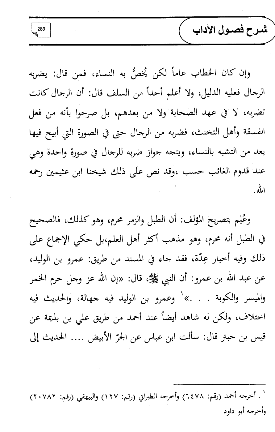 وعُلِم بتصريح المؤلف: أن الطبل والزمر محرم, وهو كذلك, فالصحيح في الطبل أنه محرم, وهو مذهب أكثر أهل العلم, بل حكي الإجماع على ذلك وفيه أخبار عِدّة, فقد جاء في المسند من طريق: عمرو بن الوليد، عن عبد الله بن عمرو: أن النبي - صلى الله عليه وسلم -، قال: «إن الله عز وجل حرم الخمر والميسر والكوبة. . .» (¬1) وعمرو بن الوليد فيه جهالة, والحديث فيه اختلاف, ولكن له شاهد أيضاً عند أحمد من طريق علي بن بذيمة عن قيس بن حبتر قال: سألت ابن عباس عن الجرّ الأبيض .... الحديث إلى