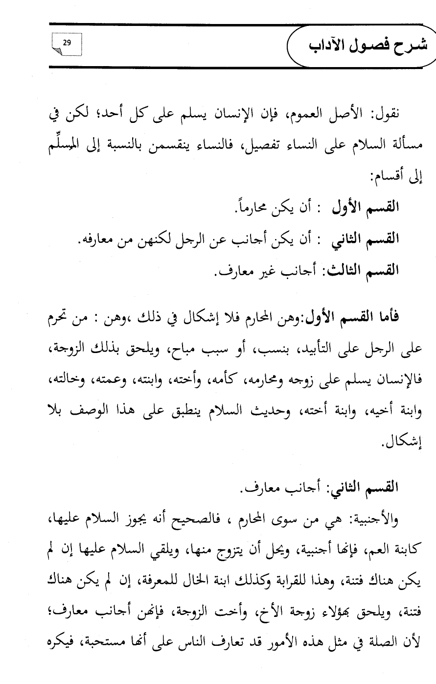 فأما القسم الأول: وهن المحارم فلا إشكال في ذلك ,وهن: من تحرم على الرجل على التأبيد, بنسب, أو سبب مباح, ويلحق بذلك الزوجة، فالإنسان يسلم على زوجه ومحارمه, كأمه, وأخته, وابنته, وعمته, وخالته, وابنة أخيه, وابنة أخته, وحديث السلام ينطبق على هذا الوصف بلا إشكال.