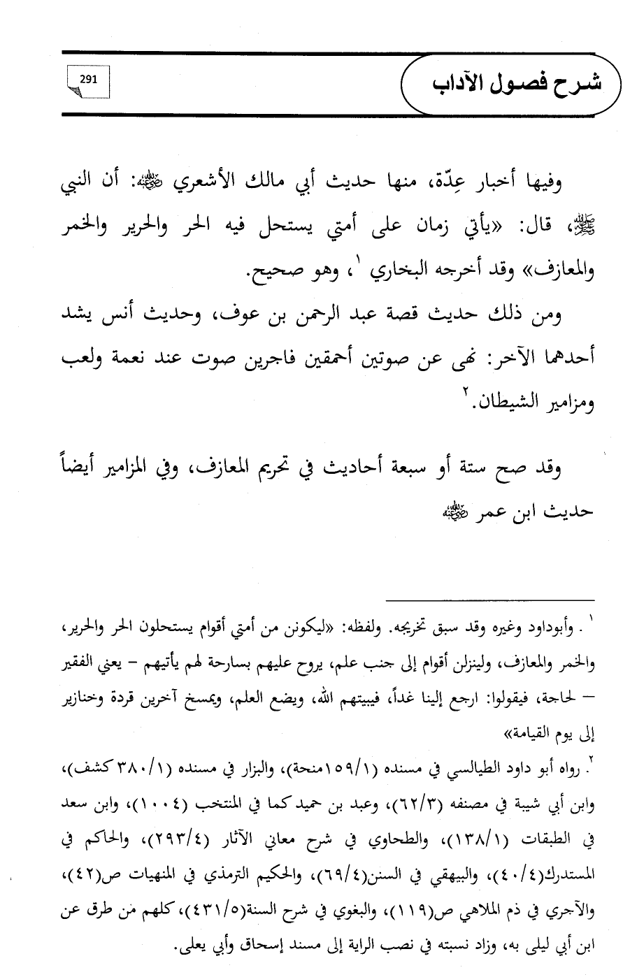 وقد صح ستة أو سبعة أحاديث في تحريم المعازف، وفي المزامير أيضاً حديث ابن عمر - رضي الله عنه -