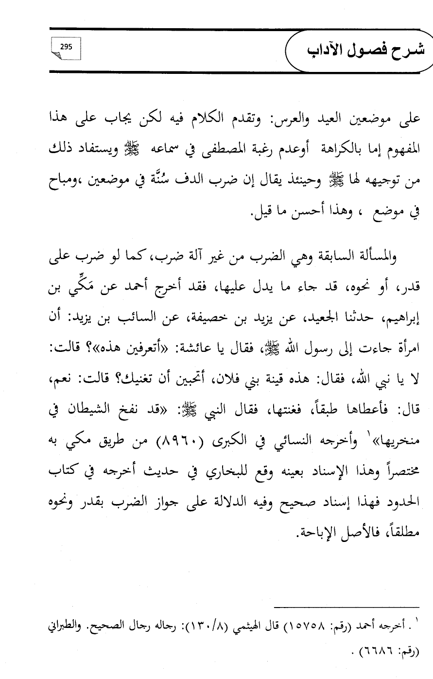 والمسألة السابقة وهي الضرب من غير آلة ضرب، كما لو ضرب على قدر، أو نحوه، قد جاء ما يدل عليها، فقد أخرج أحمد عن مَكِّي بن إبراهيم، حدثنا الجعيد، عن يزيد بن خصيفة، عن السائب بن يزيد: أن امرأة جاءت إلى رسول الله - صلى الله عليه وسلم -، فقال يا عائشة: «أتعرفين هذه»؟ قالت: لا يا نبي الله، فقال: هذه قينة بني فلان, أتحبين أن تغنيك؟ قالت: نعم، قال: فأعطاها طبقاً، فغنتها، فقال النبي - صلى الله عليه وسلم -: «قد نفخ الشيطان في منخريها» (¬1) وأخرجه النسائي في الكبرى (8960) من طريق مكي به مختصراً وهذا الإسناد بعينه وقع للبخاري في حديث أخرجه في كتاب الحدود فهذا إسناد صحيح وفيه الدلالة على جواز الضرب بقدر ونحوه مطلقاً، فالأصل الإباحة.