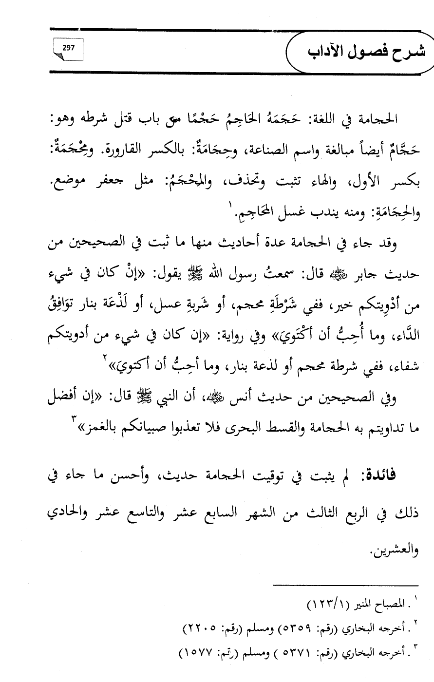 وقد جاء في الحجامة عدة أحاديث منها ما ثبت في الصحيحين من حديث جابر - رضي الله عنه - قال: سمعتُ رسول الله - صلى الله عليه وسلم - يقول: «إنْ كان في شيء من أدْوِيتكم خير، ففي شَرْطَةِ محجم، أو شَربةِ عسل، أو لَذْعَة بنار توَافِقُ الدَّاء، وما أُحِبُّ أن أكْتَويَ» وفي رواية: «إن كان في شيء من أدويتكم شفاء، ففي شرطة محجم أو لذعة بنار، وما أحِبُّ أن أكتويَ» (¬2)