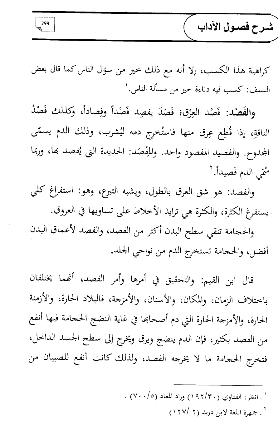 والفصد: هو شق العرق بالطول، ويشبه التبرع، وهو: استفراغ كلي يستفرغ الكثرة، والكثرة هي تزايد الأخلاط على تساويها في العروق.