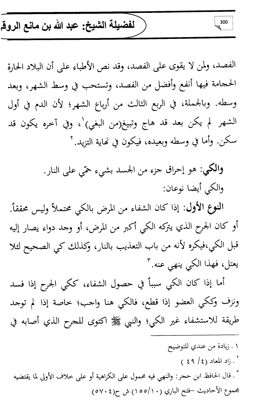 النوع الأول: إذا كان الشفاء من المرض بالكي محتملاً وليس محققاً. أو كان الجرح الذي يتركه الكي أكبر من المرض، أو وجد دواء يصار إليه قبل الكي، فيكره لأنه من باب التعذيب بالنار، وكذلك كي الصحيح لئلا يعتل، فهذا الكي ينهي عنه. (¬3)
