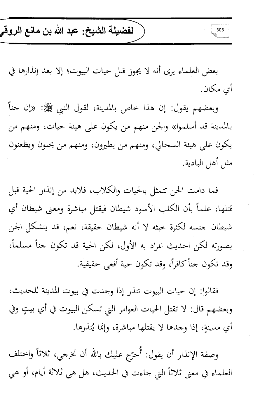 فقالوا: إن حيات البيوت تنذر إذا وجدت في بيوت المدينة للحديث، وبعضهم قال: لا تقتل الحيات العوامر التي تسكن البيوت في أي بيتٍ وفي أي مدينةٍ، إذا وجدها لا يقتلها مباشرة، وإنما يُنذرها.