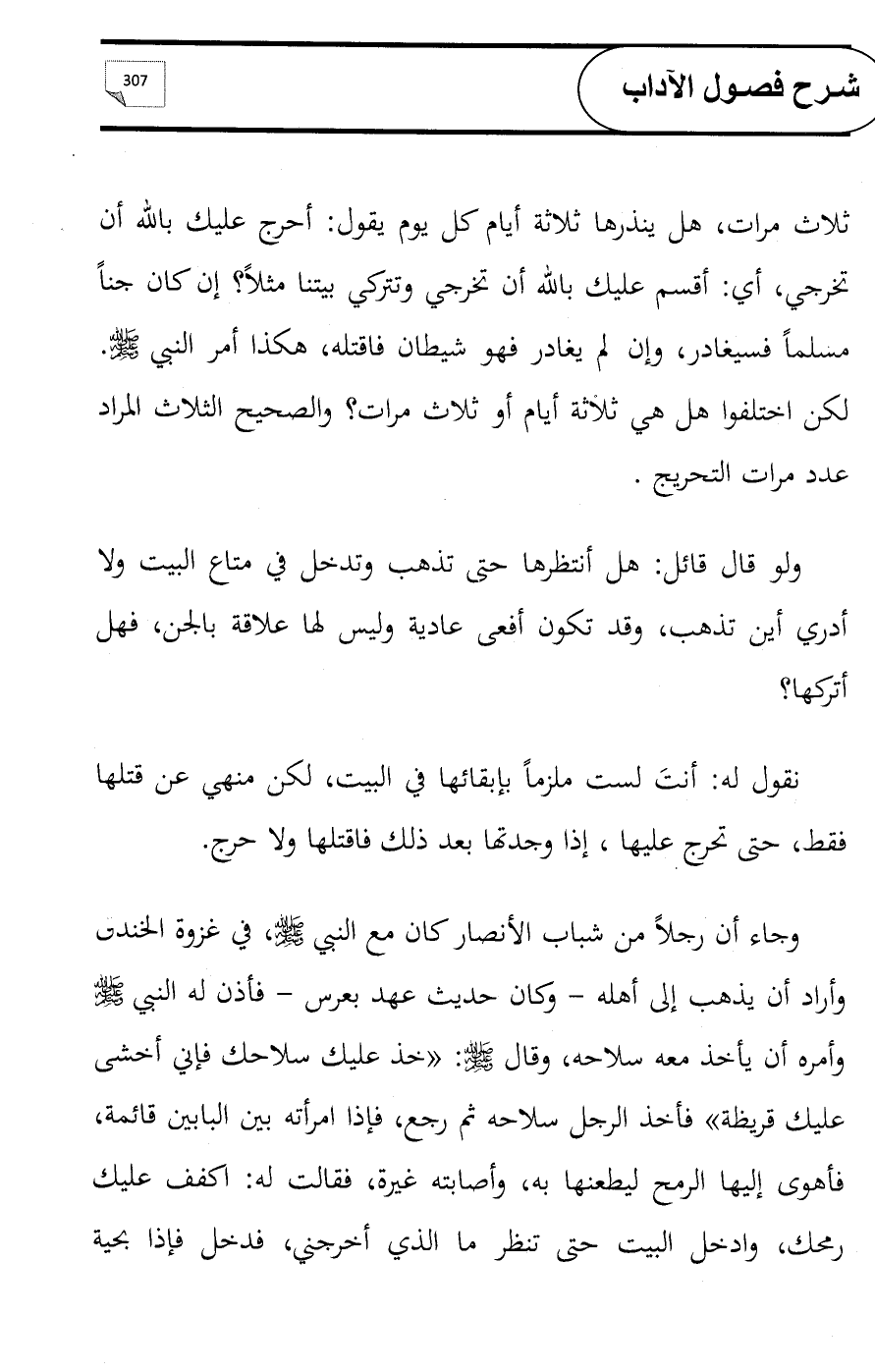 ثلاث مرات، هل ينذرها ثلاثة أيام كل يوم يقول: أحرج عليك بالله أن تخرجي، أي: أقسم عليك بالله أن تخرجي وتتركي بيتنا مثلاً؟ إن كان جناً مسلماً فسيغادر، وإن لم يغادر فهو شيطان فاقتله، هكذا أمر النبي - صلى الله عليه وسلم -. لكن اختلفوا هل هي ثلاثة أيام أو ثلاث مرات؟ والصحيح الثلاث المراد عدد مرات التحريج.