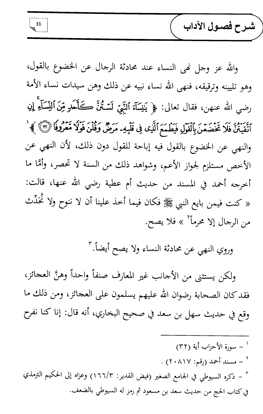 والله عز وجل نهى النساء عند محادثة الرجال عن الخضوع بالقول، وهو تليينه وترقيقه، فنهى الله نساء نبيه عن ذلك وهن سيدات نساء الأمة رضي الله عنهن، فقال تعالى: {يَانِسَاءَ النَّبِيِّ لَسْتُنَّ كَأَحَدٍ مِنَ النِّسَاءِ إِنِ اتَّقَيْتُنَّ فَلَا تَخْضَعْنَ بِالْقَوْلِ فَيَطْمَعَ الَّذِي فِي قَلْبِهِ مَرَضٌ وَقُلْنَ قَوْلًا مَعْرُوفًا (32)} (¬1) والنهي عن الخضوع بالقول فيه إباحة للقول دون ذلك، لأن النهي عن الأخص مستلزم لجواز الأعم، وشواهد ذلك من السنة لا تحصر، وأمَّا ما أخرجه أحمد في المسند من حديث أم عطية رضي الله عنها، قالت: ... «كنت فيمن بايع النبي - صلى الله عليه وسلم - فكان فيما أخذ علينا أن لا ننوح ولا نُحَدِّث من الرجال إلا محرماً (¬2)» فلا يصح.