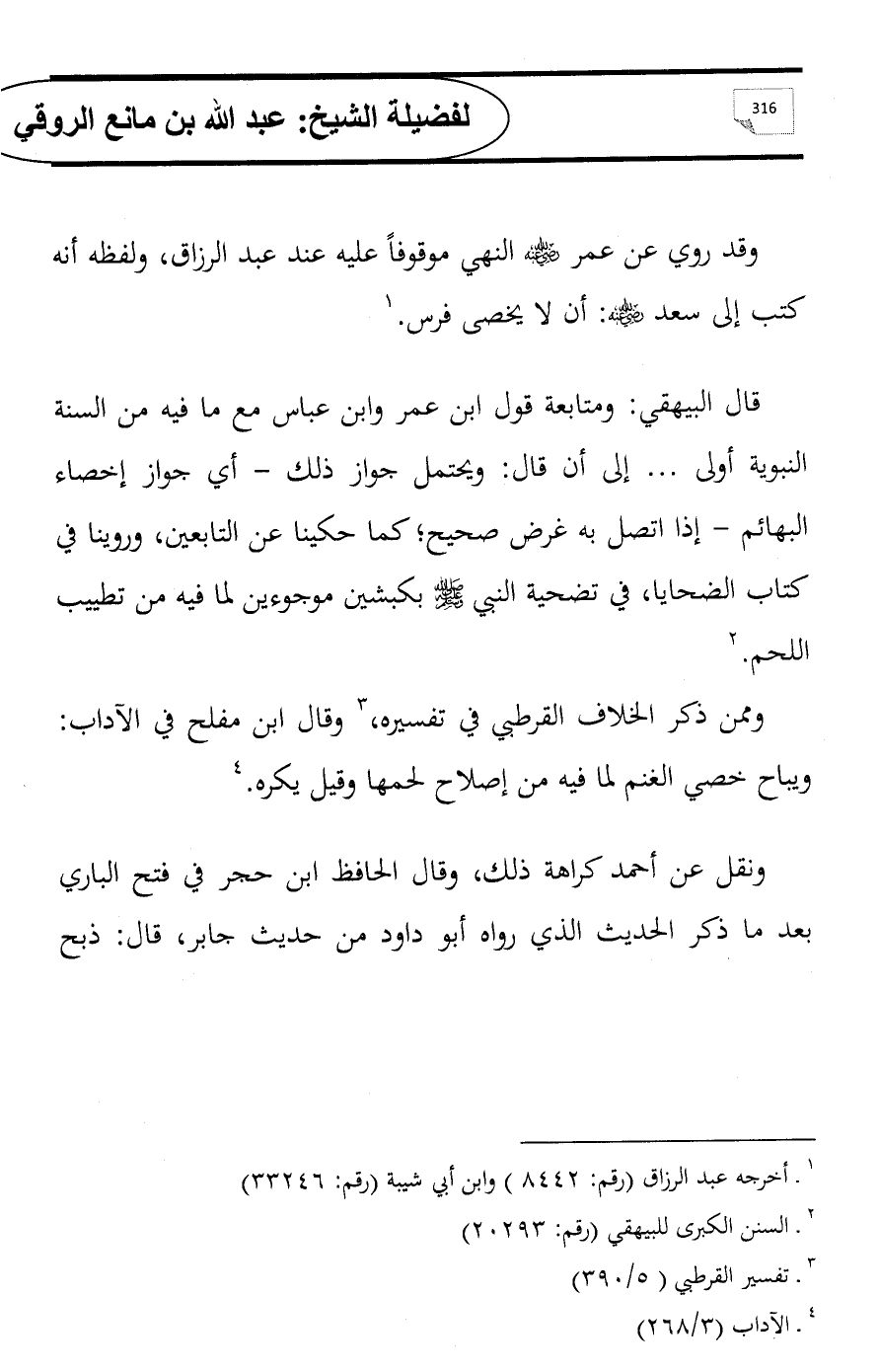 قال البيهقي: ومتابعة قول ابن عمر وابن عباس مع ما فيه من السنة النبوية أولى ... إلى أن قال: ويحتمل جواز ذلك - أي جواز إخصاء البهائم - إذا اتصل به غرض صحيح؛ كما حكينا عن التابعين، وروينا في كتاب الضحايا، في تضحية النبي - صلى الله عليه وسلم - بكبشين موجوءين لما فيه من تطييب اللحم. (¬2)