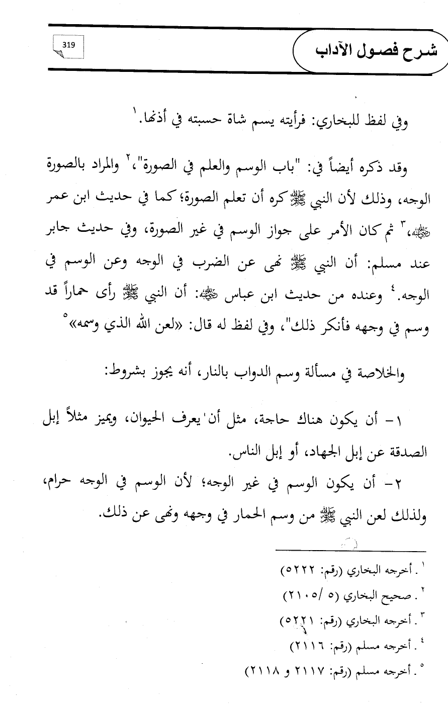 2 - أن يكون الوسم في غير الوجه؛ لأن الوسم في الوجه حرام, ولذلك لعن النبي - صلى الله عليه وسلم - من وسم الحمار في وجهه ونهى عن ذلك.