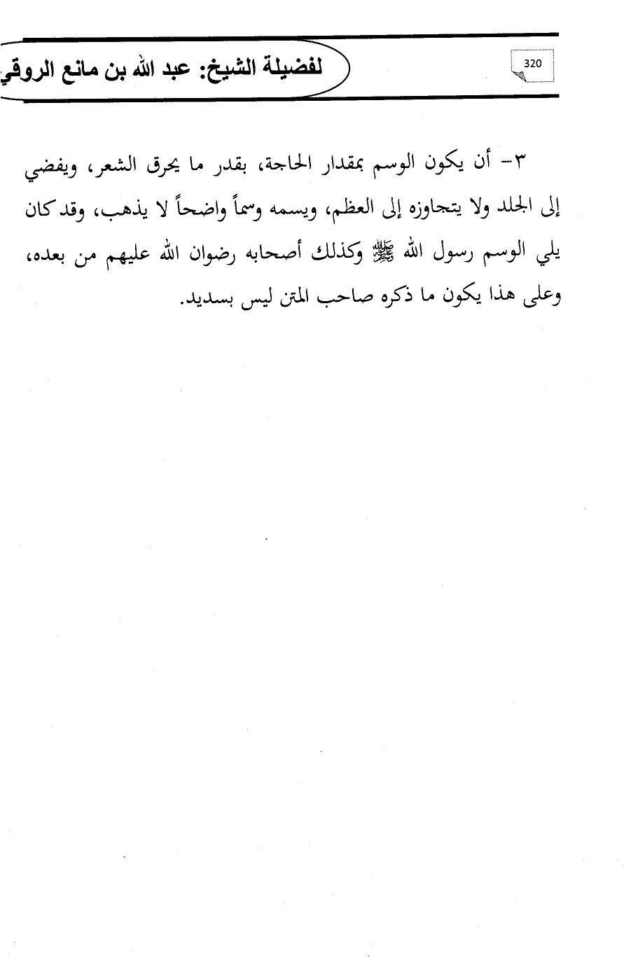 3 - أن يكون الوسم بمقدار الحاجة, بقدر ما يحرق الشعر, ويفضي إلى الجلد ولا يتجاوزه إلى العظم, ويسمه وسماً واضحاً لا يذهب، وقد كان يلي الوسم رسول الله - صلى الله عليه وسلم - وكذلك أصحابه رضوان الله عليهم من بعده, وعلى هذا يكون ما ذكره صاحب المتن ليس بسديد.
