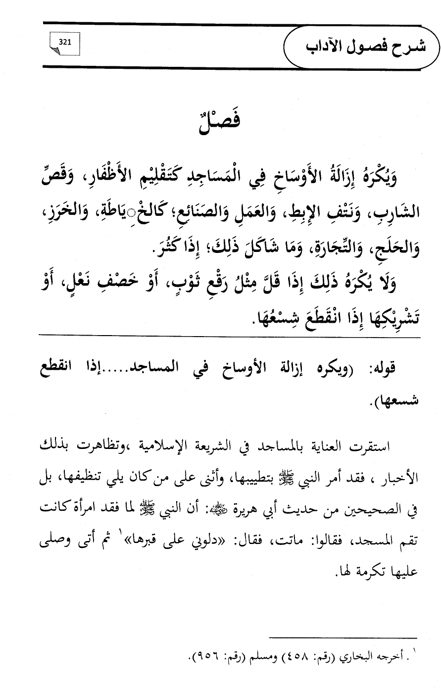 وَيُكْرَهُ إِزَالَةُ الأَوْسَاخِ فِي الْمَسَاجِدِ كَتَقْلِيْمِ الأَظْفَارِ، وَقَصِّ الشَارِبِ، وَنَتْفِ الإِبِطِ، وَالعَمَلِ وَالصَنَائِعِ؛ كَالخِيَاطَةِ، وَالخَرَزِ، وَالحَلَجِ، وَالتِّجَارَةِ، وَمَا شَاكَلَ ذَلِكَ؛ إِذَا كَثُرَ.