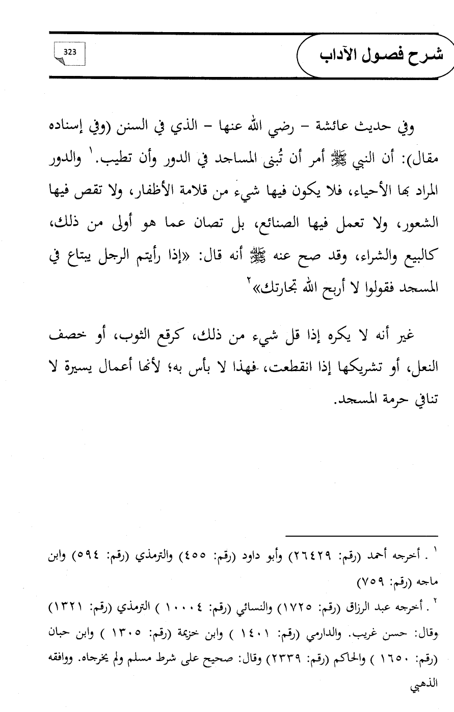 وفي حديث عائشة - رضي الله عنها - الذي في السنن (وفي إسناده مقال): أن النبي - صلى الله عليه وسلم - أمر أن تُبنى المساجد في الدور وأن تطيب. (¬1) والدور المراد بها الأحياء، فلا يكون فيها شيء من قلامة الأظفار, ولا تقص فيها الشعور, ولا تعمل فيها الصنائع، بل تصان عما هو أولى من ذلك, كالبيع والشراء, وقد صح عنه - صلى الله عليه وسلم - أنه قال: «إذا رأيتم الرجل يبتاع في المسجد فقولوا لا أربح الله تجارتك» (¬2)
