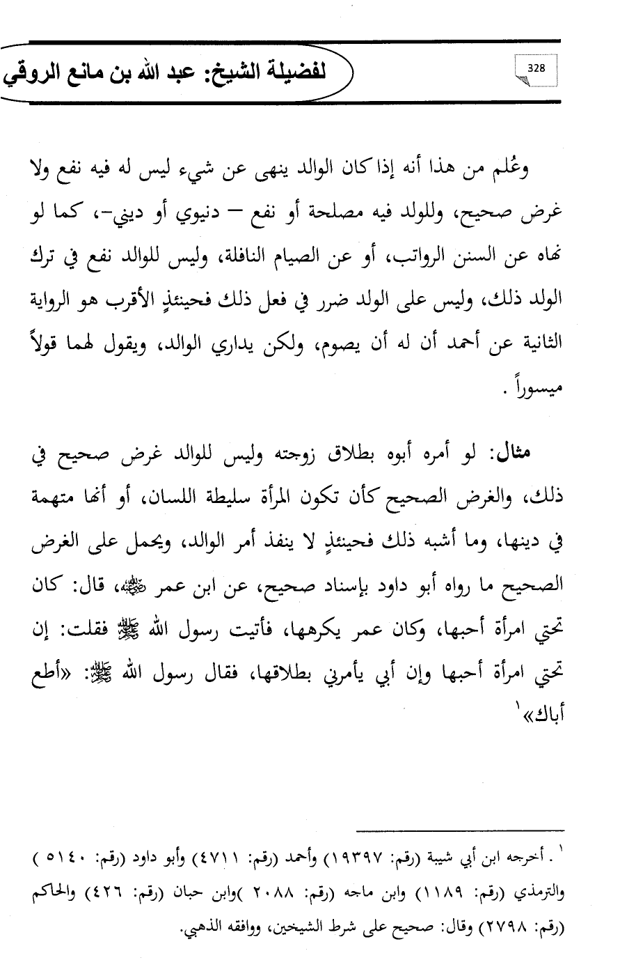 مثال: لو أمره أبوه بطلاق زوجته وليس للوالد غرض صحيح في ذلك, والغرض الصحيح كأن تكون المرأة سليطة اللسان, أو أنها متهمة في دينها, وما أشبه ذلك فحينئذٍ لا ينفذ أمر الوالد, ويحمل على الغرض الصحيح ما رواه أبو داود بإسناد صحيح، عن ابن عمر - رضي الله عنه -، قال: كان تحتي امرأة أحبها, وكان عمر يكرهها, فأتيت رسول الله - صلى الله عليه وسلم - فقلت: إن تحتي امرأة أحبها وإن أبي يأمرني بطلاقها, فقال رسول الله - صلى الله عليه وسلم -: «أطع أباك» (¬1)