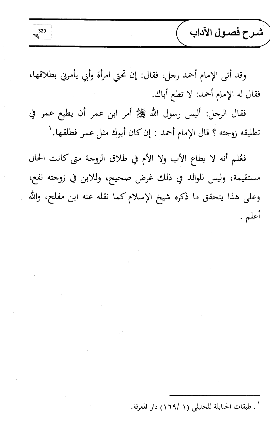 وقد أتى الإمام أحمد رجل، فقال: إن تحتي امرأة وأبي يأمرني بطلاقها, فقال له الإمام أحمد: لا تطع أباك.