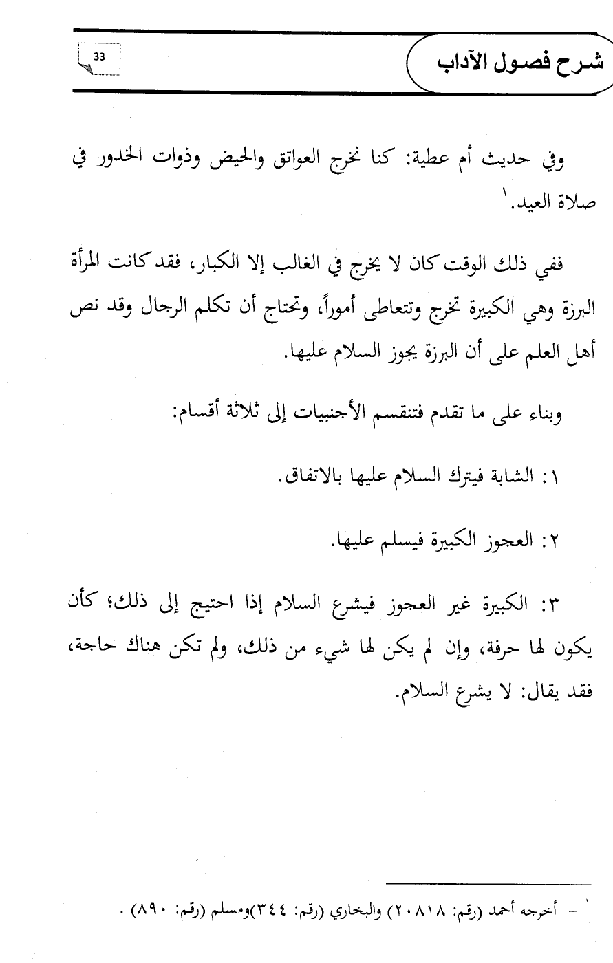3: الكبيرة غير العجوز فيشرع السلام إذا احتيج إلى ذلك؛ كأن يكون لها حرفة، وإن لم يكن لها شيء من ذلك، ولم تكن هناك حاجة، فقد يقال: لا يشرع السلام.