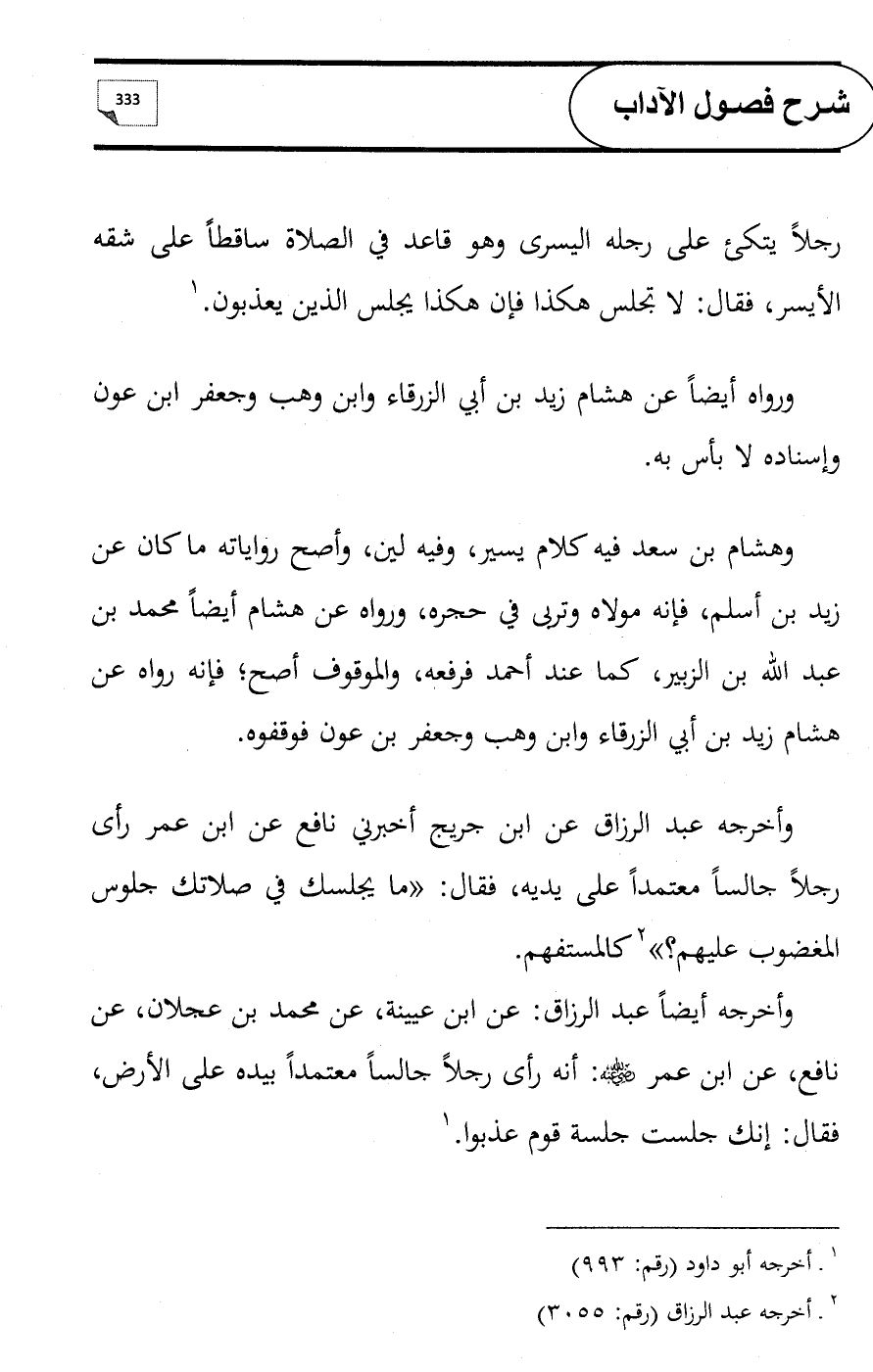 وأخرجه عبد الرزاق عن ابن جريج أخبرني نافع عن ابن عمر رأى رجلاً جالساً معتمداً على يديه، فقال: «ما يجلسك في صلاتك جلوس المغضوب عليهم؟» (¬2) كالمستفهم.
