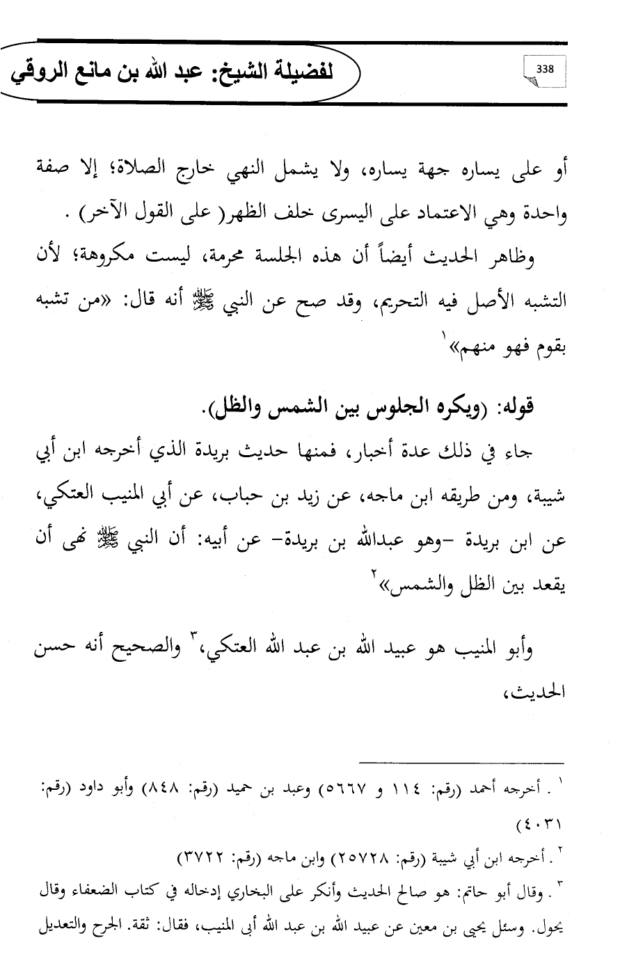 جاء في ذلك عدة أخبار, فمنها حديث بريدة الذي أخرجه ابن أبي شيبة، ومن طريقه ابن ماجه، عن زيد بن حباب، عن أبي المنيب العتكي, عن ابن بريدة -وهو عبدالله بن بريدة- عن أبيه: أن النبي - صلى الله عليه وسلم - نهى أن يقعد بين الظل والشمس» (¬2)