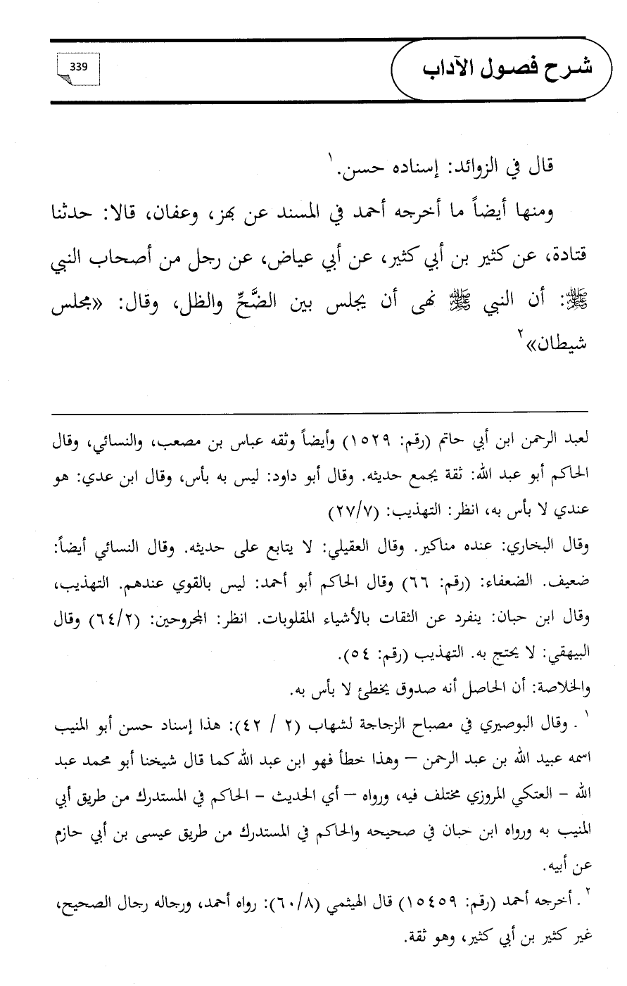 ومنها أيضاً ما أخرجه أحمد في المسند عن بهز، وعفان، قالا: حدثنا قتادة، عن كثير بن أبي كثير، عن أبي عياض، عن رجل من أصحاب النبي - صلى الله عليه وسلم -: أن النبي - صلى الله عليه وسلم - نهى أن يجلس بين الضَّحِّ والظل، وقال: «مجلس شيطان» (¬2)