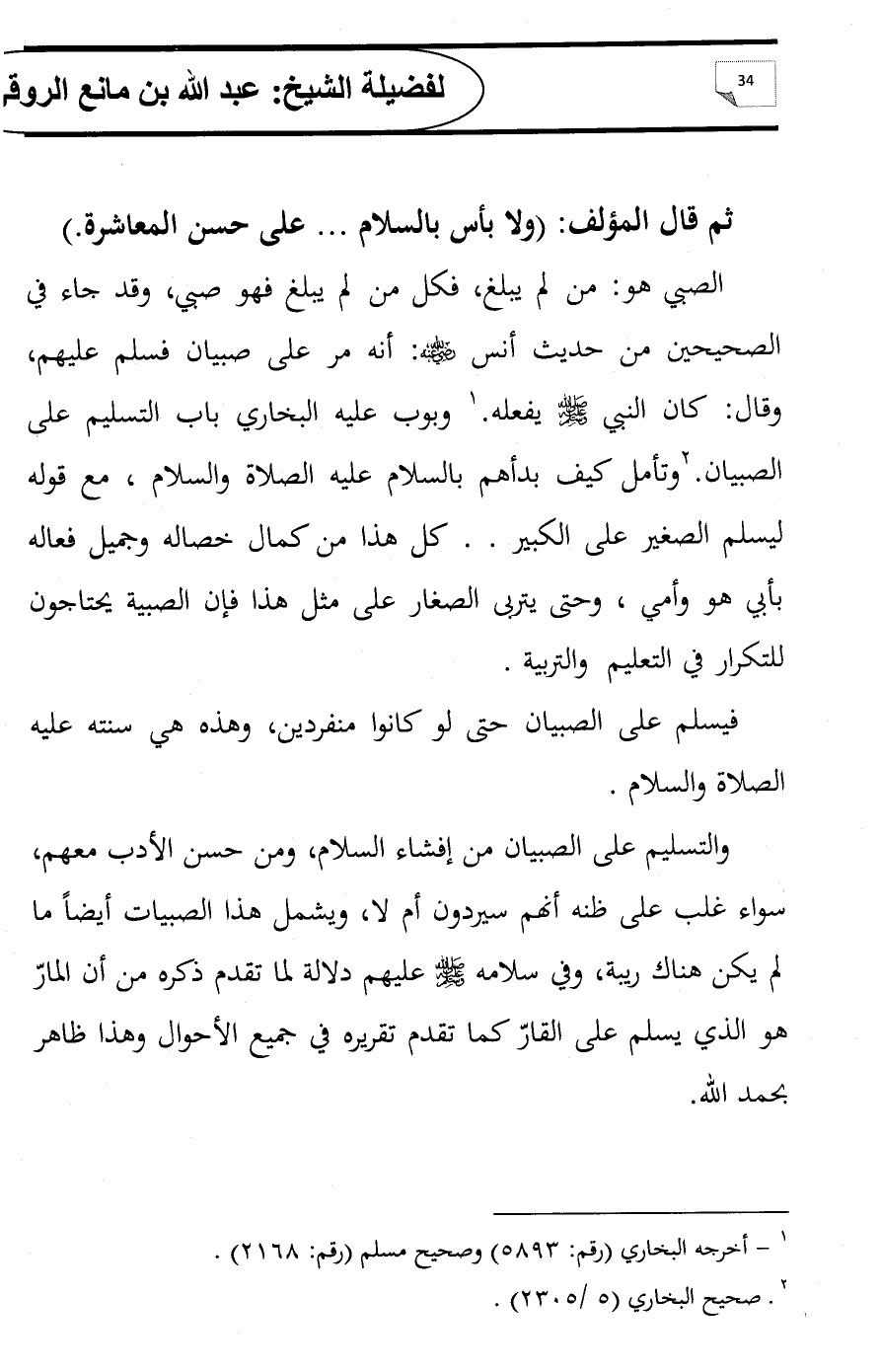 والتسليم على الصبيان من إفشاء السلام, ومن حسن الأدب معهم, سواء غلب على ظنه أنهم سيردون أم لا، ويشمل هذا الصبيات أيضاً ما لم يكن هناك ريبة، وفي سلامه - صلى الله عليه وسلم - عليهم دلالة لما تقدم ذكره من أن المارّ هو الذي يسلم على القارّ كما تقدم تقريره في جميع الأحوال وهذا ظاهر بحمد الله.