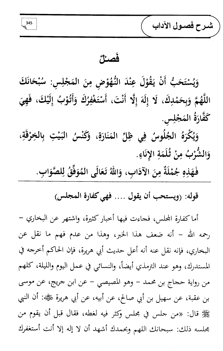 وَيُسْتَحَبُّ أَنْ يَقُوْلَ عِنْدَ النُّهُوْضِ مِنَ المَجْلِسِ: سُبْحَانَكَ اللَّهُمَّ وَبِحَمْدِكَ، لَا إِلَهَ إِلَّا أَنْتَ، أَسْتَغْفِرُكَ وَأَتُوْبُ إِلَيْكَ، فَهِيَ كَفَّارَةُ المَجْلِسِ.