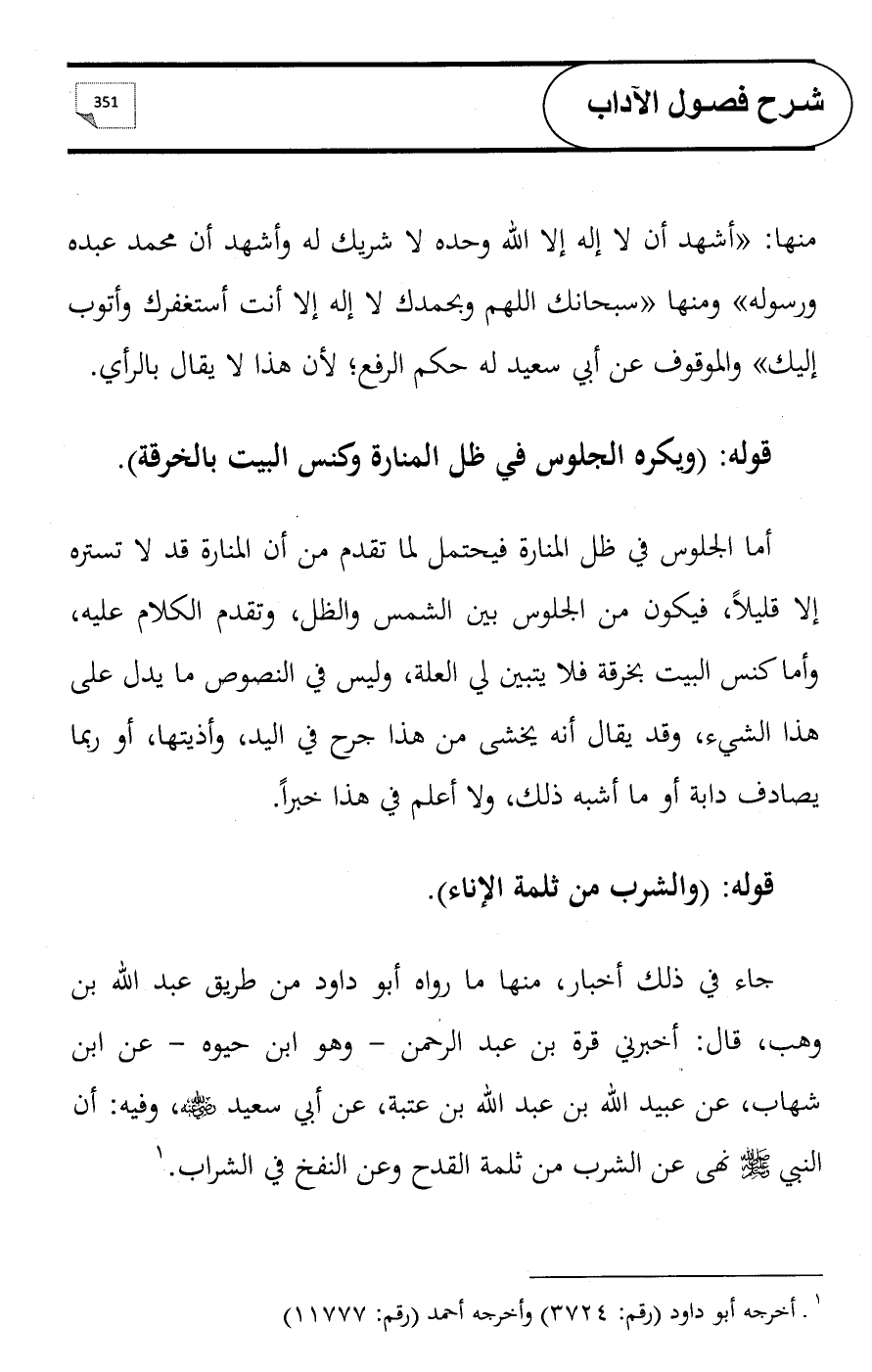 أما الجلوس في ظل المنارة فيحتمل لما تقدم من أن المنارة قد لا تستره إلا قليلاً، فيكون من الجلوس بين الشمس والظل, وتقدم الكلام عليه, وأما كنس البيت بخرقة فلا يتبين لي العلة, وليس في النصوص ما يدل على هذا الشيء, وقد يقال أنه يخشى من هذا جرح في اليد, وأذيتها, أو ربما يصادف دابة أو ما أشبه ذلك, ولا أعلم في هذا خبراً.
