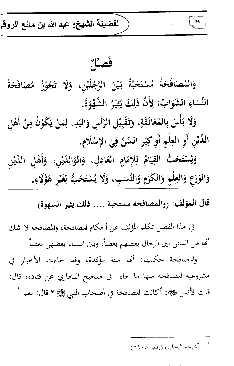 وَالمُصَافَحَةُ مُسْتَحَبَّةٌ بَيْنَ الرَّجُلَيْنِ، وَلَا تَجُوْزُ مُصَافَحَةُ النِّسَاءِ الشَوَابِّ؛ لِأَنَّ ذَلِكَ يُثِيْرُ الشَّهْوَةَ.
