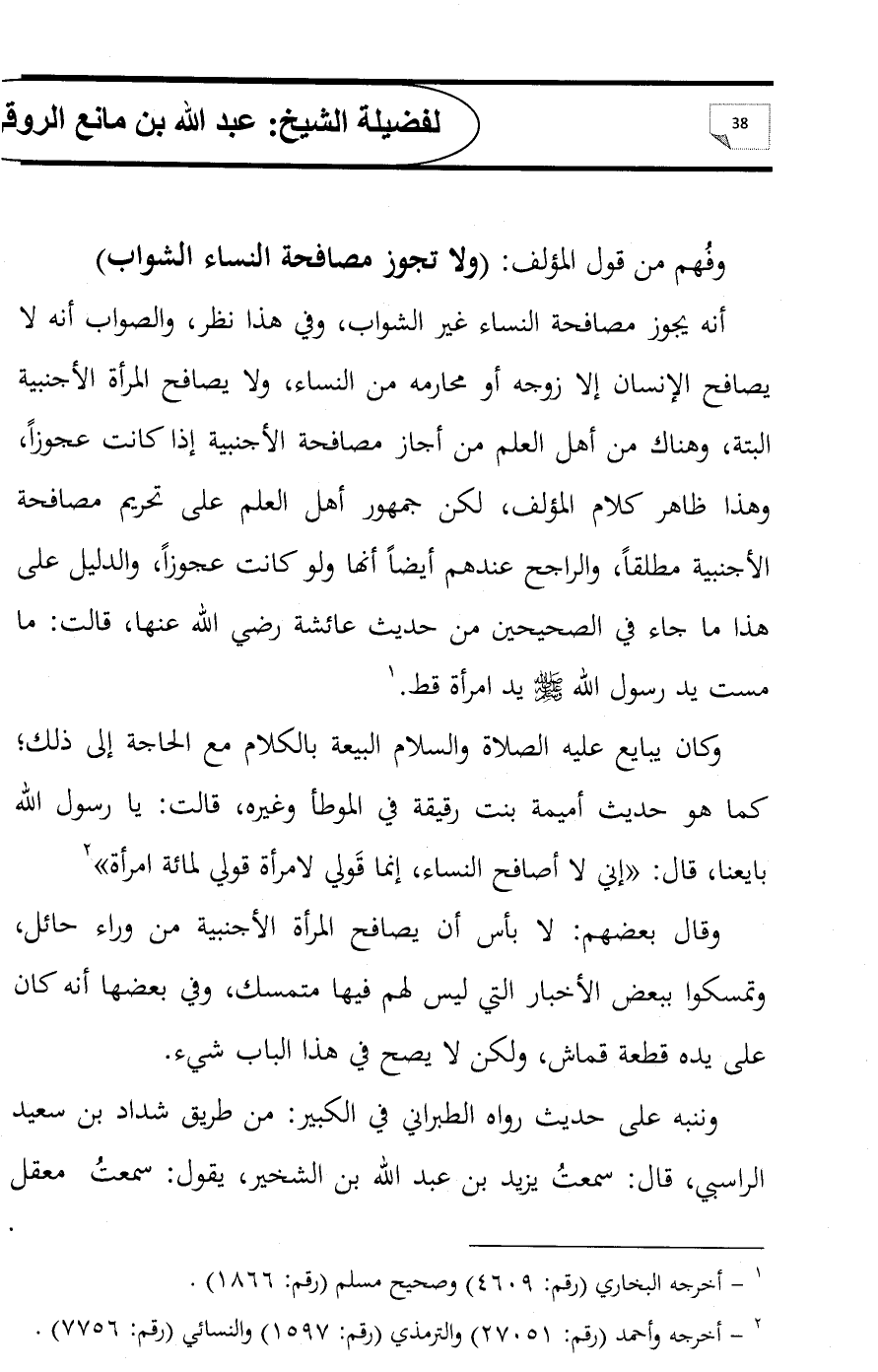 أنه يجوز مصافحة النساء غير الشواب, وفي هذا نظر, والصواب أنه لا يصافح الإنسان إلا زوجه أو محارمه من النساء, ولا يصافح المرأة الأجنبية البتة, وهناك من أهل العلم من أجاز مصافحة الأجنبية إذا كانت عجوزاً, وهذا ظاهر كلام المؤلف, لكن جمهور أهل العلم على تحريم مصافحة الأجنبية مطلقاً, والراجح عندهم أيضاً أنها ولو كانت عجوزاً, والدليل على هذا ما جاء في الصحيحين من حديث عائشة رضي الله عنها، قالت: ما مست يد رسول الله - صلى الله عليه وسلم - يد امرأة قط. (¬1)