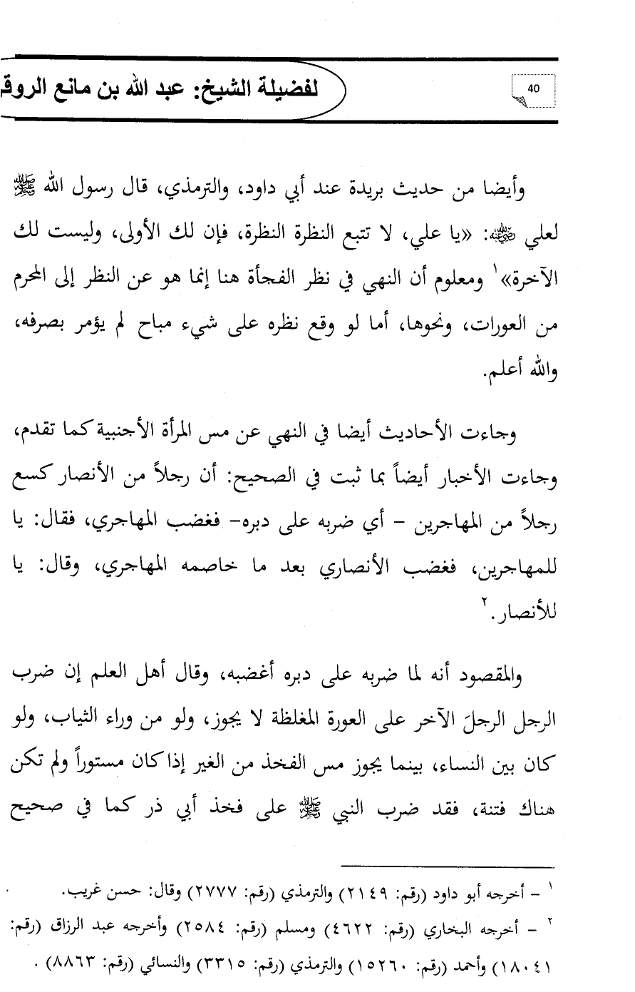 وأيضا من حديث بريدة عند أبي داود، والترمذي، قال رسول الله - صلى الله عليه وسلم - لعلي - رضي الله عنه -: «يا علي، لا تتبع النظرة النظرة، فإن لك الأولى، وليست لك الآخرة» (¬1) ومعلوم أن النهي في نظر الفجأة هنا إنما هو عن النظر إلى المحرم من العورات، ونحوها، أما لو وقع نظره على شيء مباح لم يؤمر بصرفه، والله أعلم.