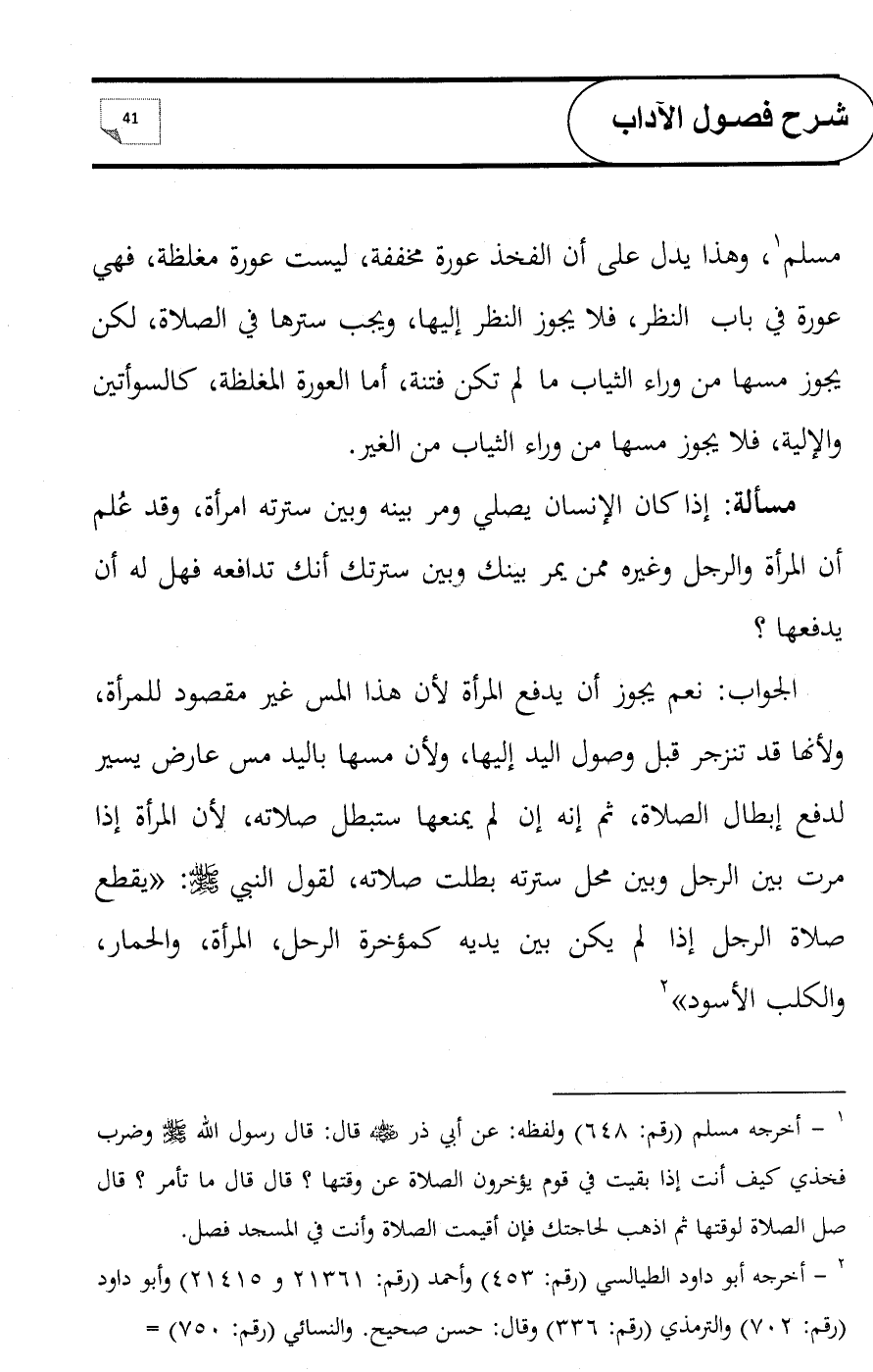 الجواب: نعم يجوز أن يدفع المرأة لأن هذا المس غير مقصود للمرأة, ولأنها قد تنزجر قبل وصول اليد إليها, ولأن مسها باليد مس عارض يسير لدفع إبطال الصلاة, ثم إنه إن لم يمنعها ستبطل صلاته, لأن المرأة إذا مرت بين الرجل وبين محل سترته بطلت صلاته, لقول النبي - صلى الله عليه وسلم -: «يقطع صلاة الرجل إذا لم يكن بين يديه كمؤخرة الرحل، المرأة، والحمار، والكلب الأسود» (¬2)