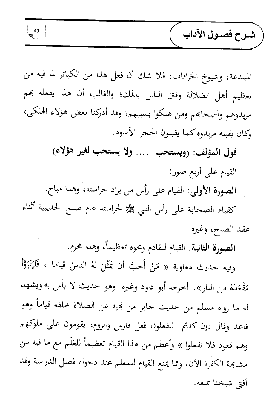 وفيه حديث معاوية «مَنْ أَحبَّ أن يَمْثُلَ لهُ الناسُ قياما، فَليَتَبَوَّأ مَقْعَدَهُ من النار». أخرجه أبو داود وغيره وهو حديث لا بأس به ويشهد له ما رواه مسلم من حديث جابر من نهيه عن الصلاة خلفه قياماً وهو قاعد وقال: إن كدتم لتفعلون فعل فارس والروم، يقومون على ملوكهم وهم قعود فلا تفعلوا» وأعظم من هذا القيام تعظيماً للعَلَم مع ما فيه من مشابهة الكفرة الآن، ومما يمنع القيام للمعلم عند دخوله فصل الدراسة وقد أفتى شيخنا بمنعه.
