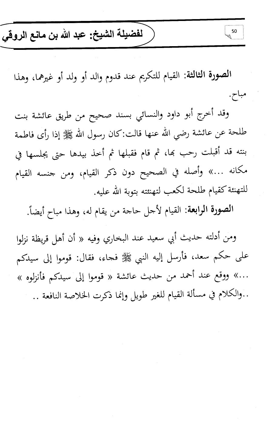 وقد أخرج أبو داود والنسائي بسند صحيح من طريق عائشة بنت طلحة عن عائشة رضي الله عنها قالت: كان رسول الله - صلى الله عليه وسلم - إذا رأى فاطمة بنته قد أقبلت رحب بها، ثم قام فقبلها ثم أخذ بيدها حتى يجلسها في مكانه ...» وأصله في الصحيح دون ذكر القيام، ومن جنسه القيام للتهنئة كقيام طلحة لكعب لتهنئته بتوبة الله عليه.