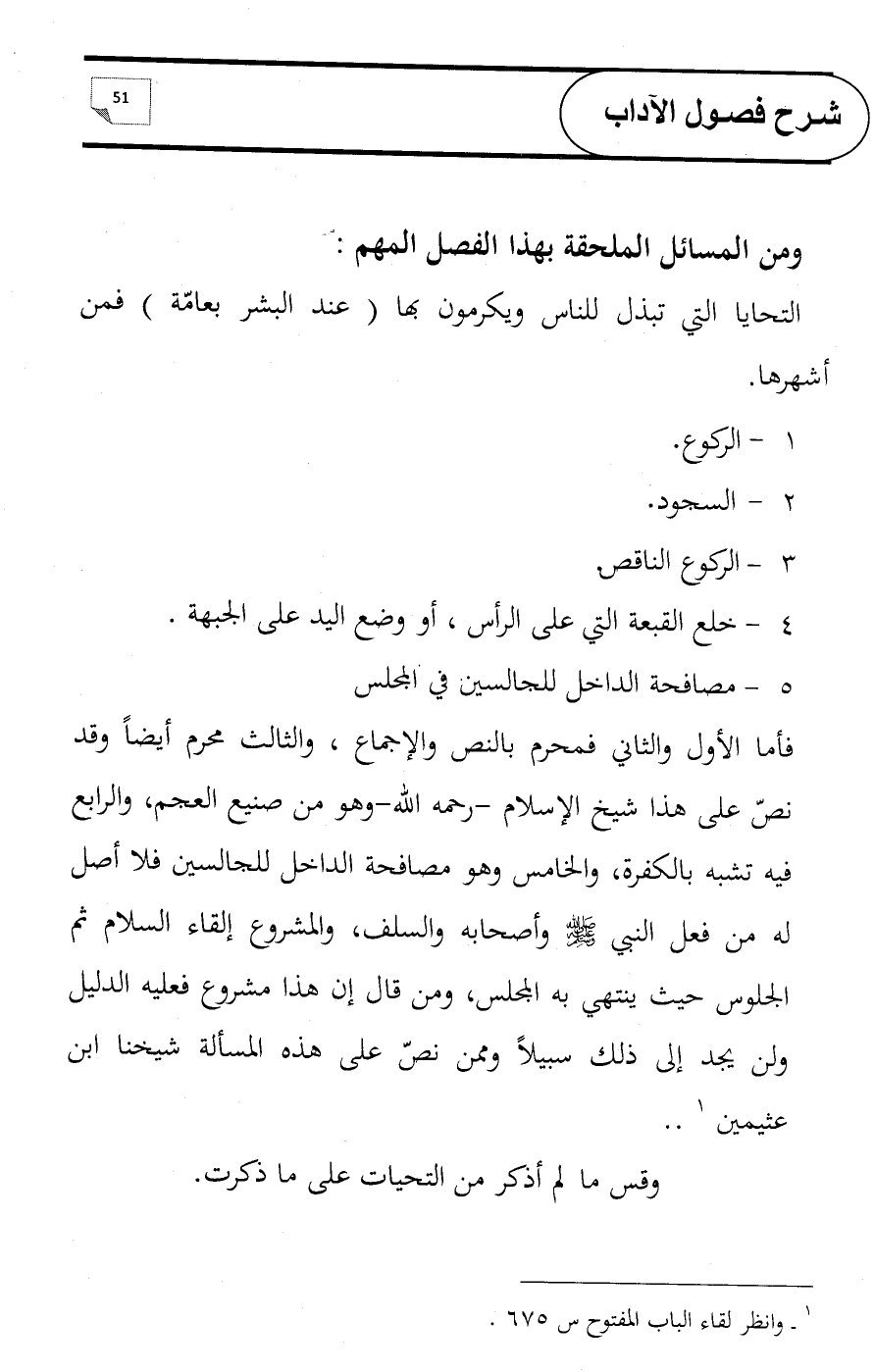 فأما الأول والثاني فمحرم بالنص والإجماع، والثالث محرم أيضاً وقد نصّ على هذا شيخ الإسلام -رحمه الله-وهو من صنيع العجم، والرابع فيه تشبه بالكفرة، والخامس وهو مصافحة الداخل للجالسين فلا أصل له من فعل النبي - صلى الله عليه وسلم - وأصحابه والسلف، والمشروع إلقاء السلام ثم الجلوس حيث ينتهي به المجلس، ومن قال إن هذا مشروع فعليه الدليل ولن يجد إلى ذلك سبيلاً وممن نصّ على هذه المسألة شيخنا ابن عثيمين (¬1) ..