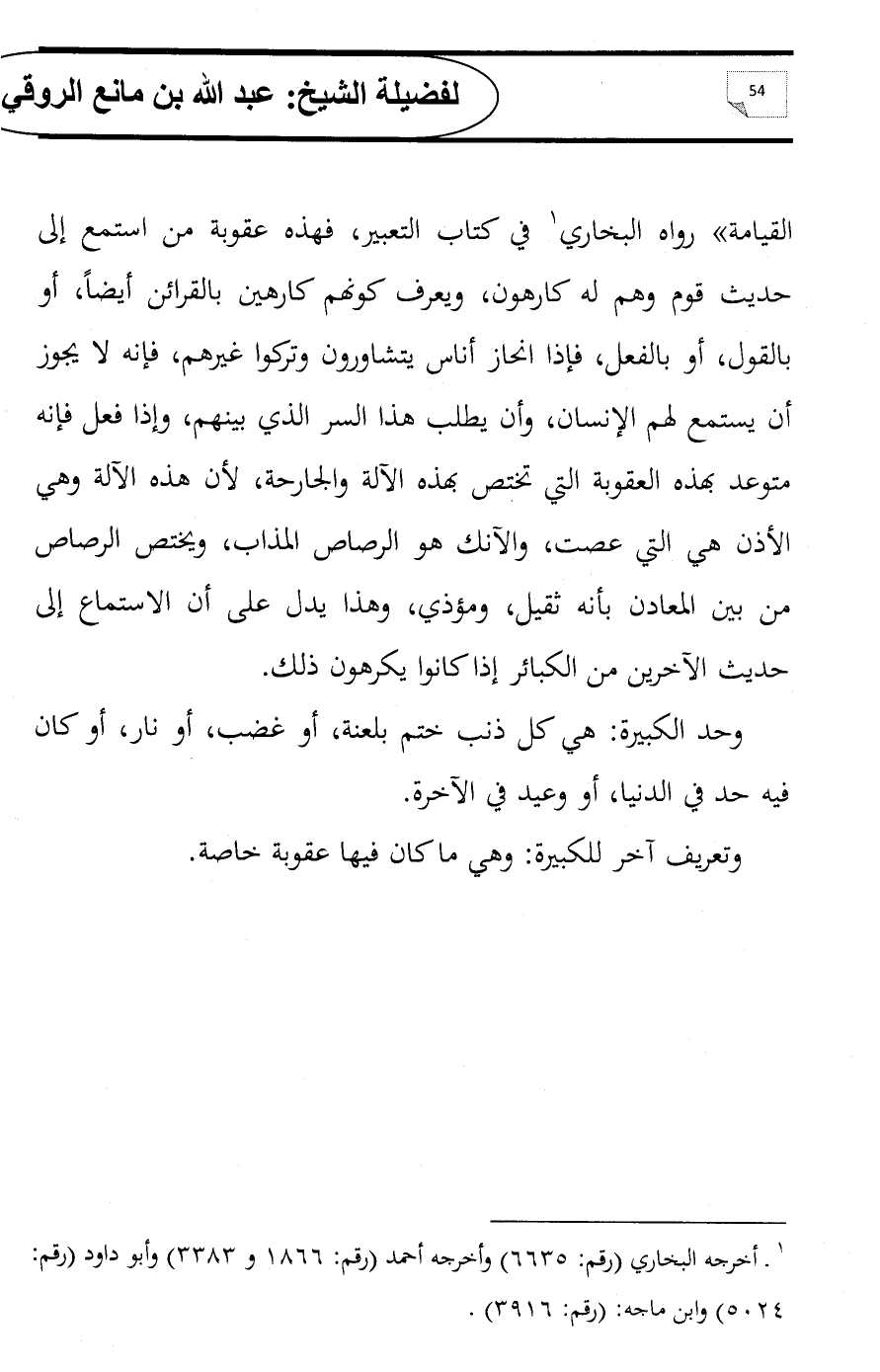 القيامة» رواه البخاري (¬1) في كتاب التعبير, فهذه عقوبة من استمع إلى حديث قوم وهم له كارهون, ويعرف كونهم كارهين بالقرائن أيضاً, أو بالقول, أو بالفعل، فإذا انحاز أناس يتشاورون وتركوا غيرهم, فإنه لا يجوز أن يستمع لهم الإنسان, وأن يطلب هذا السر الذي بينهم, وإذا فعل فإنه متوعد بهذه العقوبة التي تختص بهذه الآلة والجارحة, لأن هذه الآلة وهي الأذن هي التي عصت, والآنك هو الرصاص المذاب, ويختص الرصاص من بين المعادن بأنه ثقيل, ومؤذي, وهذا يدل على أن الاستماع إلى حديث الآخرين من الكبائر إذا كانوا يكرهون ذلك.
