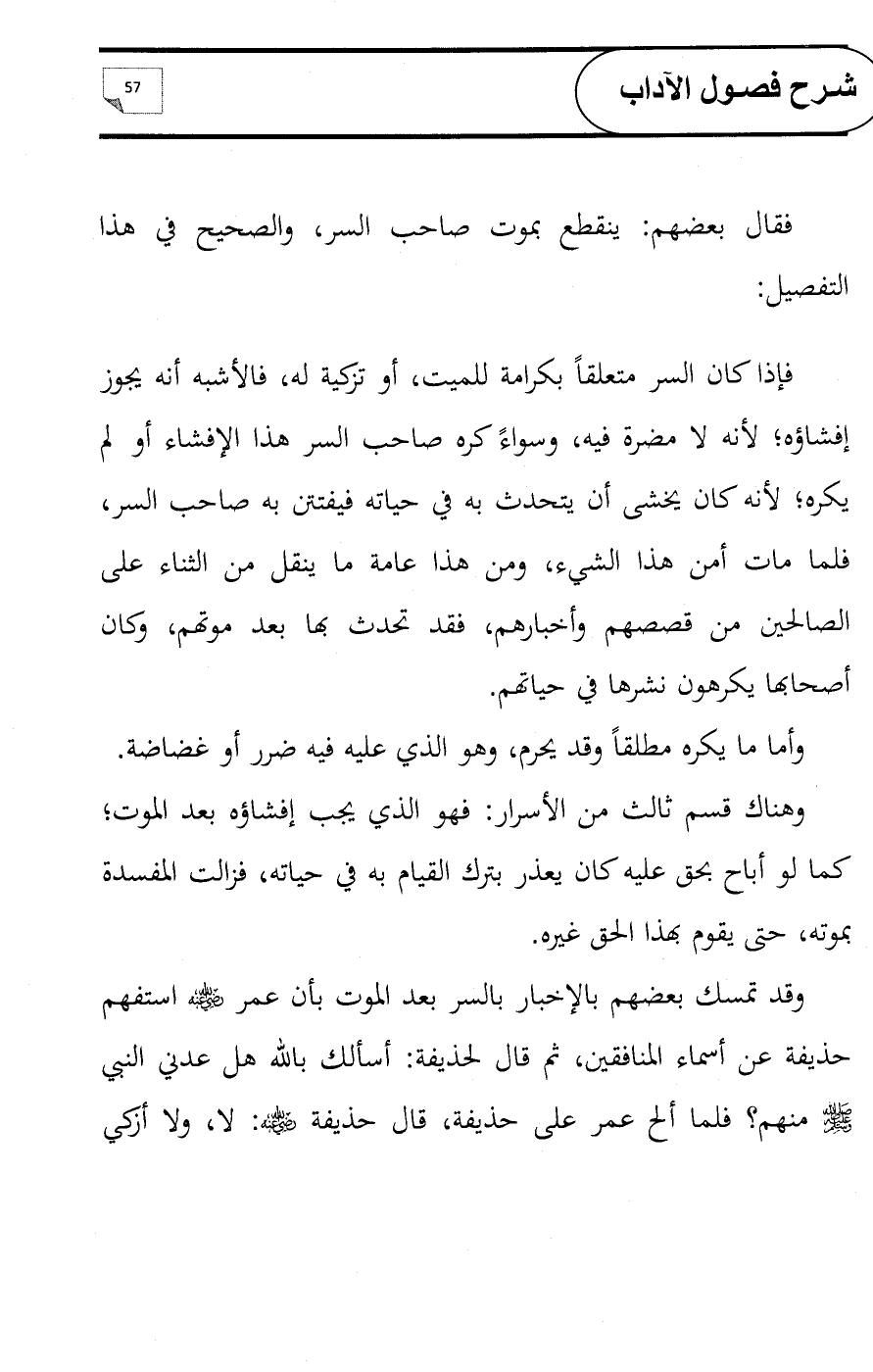 وهناك قسم ثالث من الأسرار: فهو الذي يجب إفشاؤه بعد الموت؛ كما لو أباح بحق عليه كان يعذر بترك القيام به في حياته, فزالت المفسدة بموته, حتى يقوم بهذا الحق غيره.