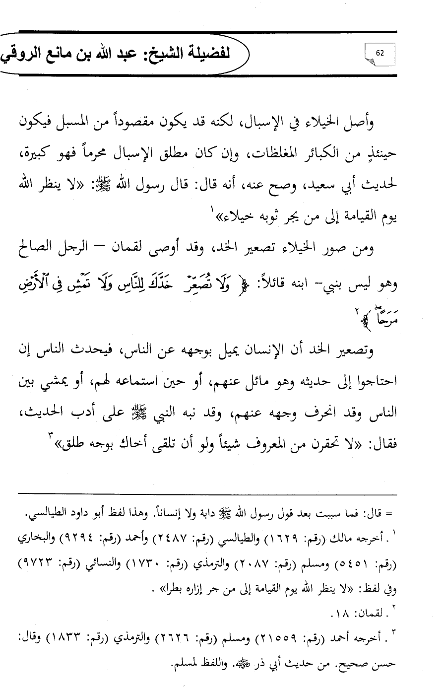 (¬1) أخرجه مالك (رقم: 1629) والطيالسي (رقم: 2487) وأحمد (رقم: 9294) والبخاري (رقم: 5451) ومسلم (رقم: 2087) والترمذي (رقم: 1730) والنسائي (رقم: 9723) وفي لفظ: «لا ينظر الله يوم القيامة إلى من جر إزاره بطرا».