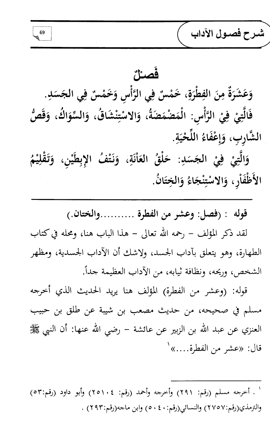 قوله: (وعشر من الفطرة) المؤلف هنا يريد الحديث الذي أخرجه مسلم في صحيحه, من حديث مصعب بن شيبة عن طلق بن حبيب العنزي عن عبد الله بن الزبير عن عائشة - رضي الله عنها: أن النبي - صلى الله عليه وسلم - قال: «عشر من الفطرة ....» (¬1)
