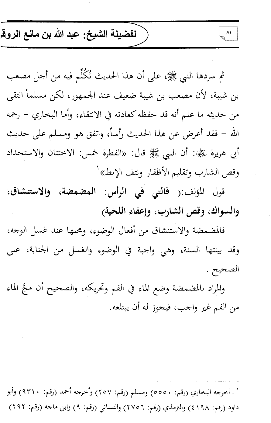 ثم سردها النبي - صلى الله عليه وسلم - , على أن هذا الحديث تُكُلِّم فيه من أجل مصعب بن شيبة, لأن مصعب بن شيبة ضعيف عند الجمهور, لكن مسلماً انتقى من حديثه ما علم أنه قد حفظه كعادته في الانتقاء, وأما البخاري - رحمه الله - فقد أعرض عن هذا الحديث رأساً, واتفق هو ومسلم على حديث أبي هريرة - رضي الله عنه -: أن النبي - صلى الله عليه وسلم - قال: «الفطرة خمس: الاختتان والاستحداد وقص الشارب وتقليم الأظفار ونتف الإبط» (¬1)