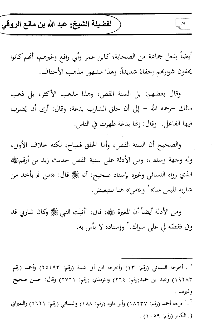 وقال بعضهم: بل السنة القص, وهذا مذهب الأكثر, بل ذهب مالك -رحمه الله - إلى أن حلق الشارب بدعة, وقال: أرى أن يُضرب فيها الفاعل. وقال: إنها بدعة ظهرت في الناس.
