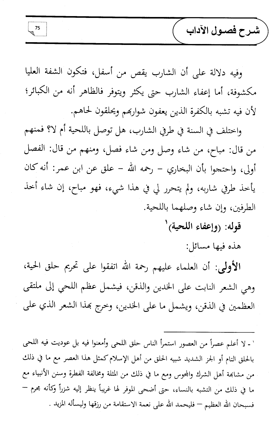 (¬1) لا أعلم عصراً من العصور استمرأ الناس حلق اللحى وأمعنوا فيه بل عوديت فيه اللحى بالحلق التام أو الجز الشديد شبيه الحلق من أهل الإسلام كمثل هذا العصر مع ما في ذلك من مشابهة أهل الشرك والمجوس ومع ما في ذلك من المثلة ومخالفة الفطرة وسنن الأنبياء مع ما في ذلك من التشبه بالنساء، حتى أضحى الموفر لها غريباً ينظر إليه شزراً وكأنه مجرم - فسبحان الله العظيم - فليحمد الله على نعمة الاستقامة من رزقها وليسأله المزيد.