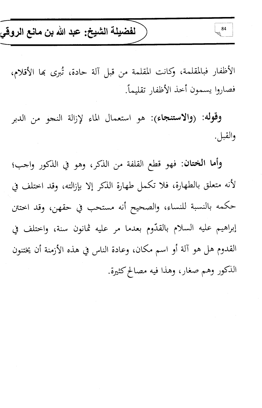 وأما الختان: فهو قطع القلفة من الذكر, وهو في الذكور واجب؛ لأنه متعلق بالطهارة, فلا تكمل طهارة الذكر إلا بإزالته, وقد اختلف في حكمه بالنسبة للنساء, والصحيح أنه مستحب في حقهن, وقد اختتن إبراهيم عليه السلام بالقدّوم بعدما مر عليه ثمانون سنة, واختلف في القدوم هل هو آلة أو اسم مكان, وعادة الناس في هذه الأزمنة أن يختنون الذكور وهم صغار, وهذا فيه مصالح كثيرة.