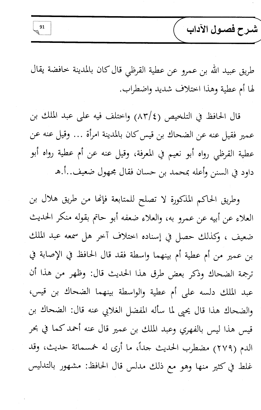 وطريق الحاكم المذكورة لا تصلح للمتابعة فإنها من طريق هلال بن العلاء عن أبيه عن عمرو به، والعلاء ضعفه أبو حاتم بقوله منكر الحديث ضعيف، وكذلك حصل في إسناده اختلاف آخر هل سمعه عبد الملك بن عمير من أم عطية أم بينهما واسطة فقد قال الحافظ في الإصابة في ترجمة الضحاك وذكر بعض طرق هذا الحديث قال: وظهر من هذا أن عبد الملك دلسه على أم عطية والواسطة بينهما الضحاك بن قيس، والضحاك هذا قال يحيى لما سأله المفضل الغلابي عنه قال: الضحاك بن قيس هذا ليس بالفهري وعبد الملك بن عمير قال عنه أحمد كما في بحر الدم (279) مضطرب الحديث جداً، ما أرى له خمسمائة حديث، وقد غلط في كثير منها وهو مع ذلك مدلس قال الحافظ: مشهور بالتدليس