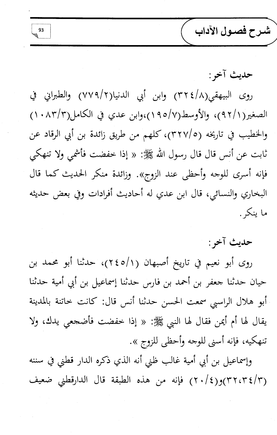 روى البيهقي (8/ 324) وابن أبي الدنيا (2/ 779) والطبراني في الصغير (1/ 92)، والأوسط (7/ 195)،وابن عدي في الكامل (3/ 1083) والخطيب في تاريخه (5/ 327)، كلهم من طريق زائدة بن أبي الرقاد عن ثابت عن أنس قال قال رسول الله - صلى الله عليه وسلم -: «إذا خفضت فأشمي ولا تنهكي فإنه أسرى للوجه وأحظى عند الزوج». وزائدة منكر الحديث كما قال البخاري والنسائي، قال ابن عدي له أحاديث أفرادات وفي بعض حديثه ما ينكر.