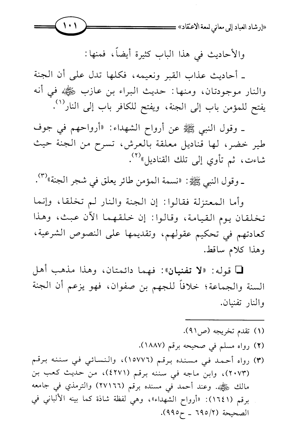 (¬3) رواه أحمد في مسنده برقم (15776)، والنسائي في سننه برقم (2073)، وابن ماجه في سننه برقم (4271)، من حديث كعب بن مالك - رضي الله عنه -. وعند أحمد في مسنده برقم (27166) والترمذي في جامعه برقم (1641): ((أرواح الشهداء))، وهي لفظة شاذة كما بينه الألباني في الصحيحة (2/ 695 - ح 995).
