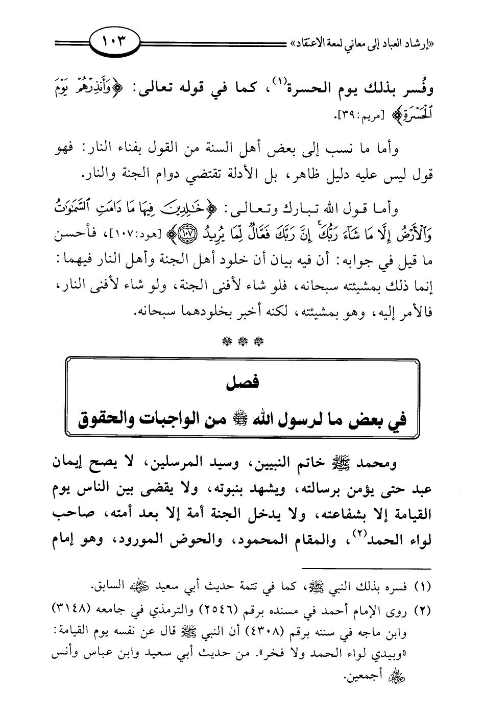 ومحمد - صلى الله عليه وسلم - خاتم النبيين، وسيد المرسلين، لا يصح إيمان عبد حتى يؤمن برسالته، ويشهد بنبوته، ولا يقضى بين الناس يوم القيامة إلا بشفاعته، ولا يدخل الجنة أمة إلا بعد أمته، صاحب لواء الحمد (¬2)، والمقام المحمود، والحوض المورود، وهو
