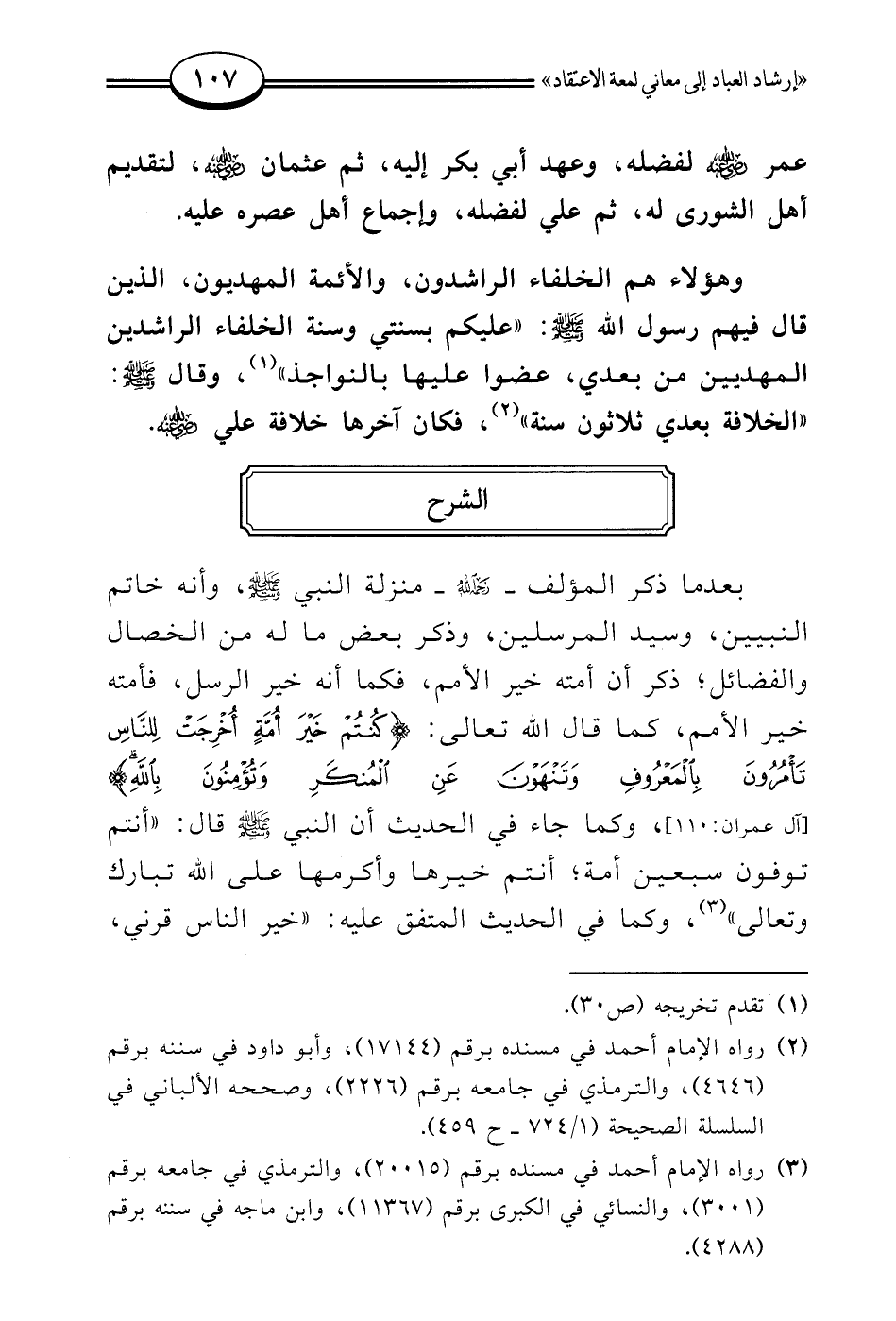 بعدما ذكر المؤلف -رحمه الله- منزلة النبي - صلى الله عليه وسلم -، وأنه خاتم النبيين، وسيد المرسلين، وذكر بعض ما له من الخصال والفضائل؛ ذكر أن أمته خير الأمم، فكما أنه خير الرسل، فأمته خير الأمم، كما قال الله تعالى: {كُنْتُمْ خَيْرَ أُمَّةٍ أُخْرِجَتْ لِلنَّاسِ تَامُرُونَ بِالْمَعْرُوفِ وَتَنْهَوْنَ عَنِ الْمُنْكَرِ وَتُؤْمِنُونَ بِاللَّهِ} [آل عمران:110]، وكما جاء في الحديث أن النبي - صلى الله عليه وسلم - قال: ((أنتم توفون سبعين أمة؛ أنتم خيرها وأكرمها على الله تبارك وتعالى)) (¬3)، وكما في الحديث المتفق عليه: ((خير الناس قرني،