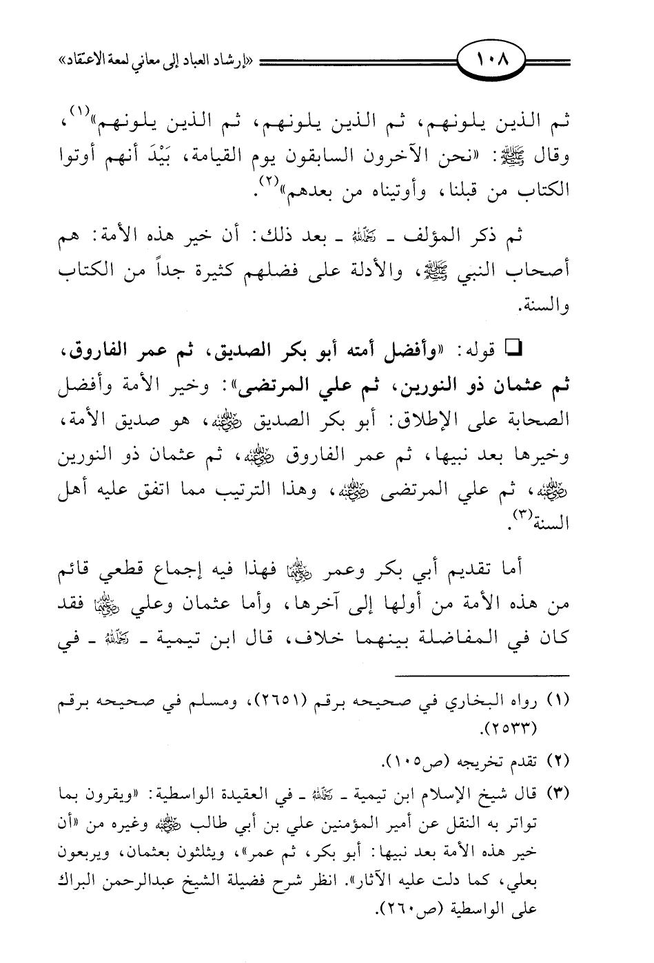 (¬3) قال شيخ الإسلام ابن تيمية -رحمه الله- في العقيدة الواسطية: ((ويقرون بما تواتر به النقل عن أمير المؤمنين علي بن أبي طالب - رضي الله عنه - وغيره من ((أن خير هذه الأمة بعد نبيها: أبو بكر، ثم عمر))، ويثلثون بعثمان، ويربعون بعلي، كما دلت عليه الآثار)). انظر شرح فضيلة الشيخ عبدالرحمن البراك على الواسطية (ص 260).