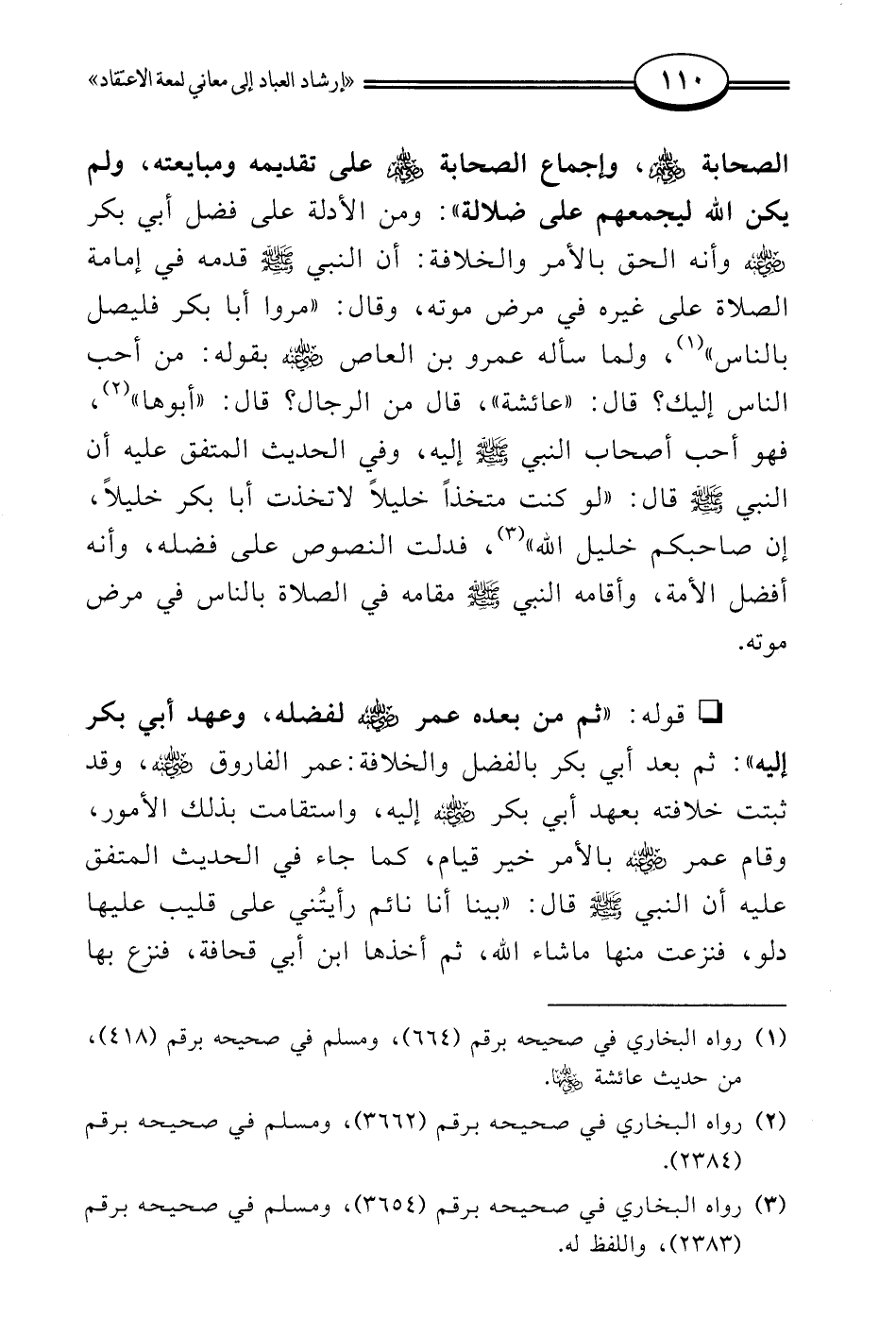 الصحابة رضي الله عنهم، وإجماع الصحابة رضي الله عنهم على تقديمه ومبايعته، ولم يكن الله ليجمعهم على ضلالة)): ومن الأدلة على فضل أبي بكر - رضي الله عنه - وأنه الحق بالأمر والخلافة: أن النبي - صلى الله عليه وسلم - قدمه في إمامة الصلاة على غيره في مرض موته، وقال: ((مروا أبا بكر فليصل بالناس)) (¬1)، ولما سأله عمرو بن العاص - رضي الله عنه - بقوله: من أحب الناس إليك؟ قال: ((عائشة))، قال من الرجال؟ قال: ((أبوها)) (¬2)، فهو أحب أصحاب النبي - صلى الله عليه وسلم - إليه، وفي الحديث المتفق عليه أن النبي - صلى الله عليه وسلم - قال: ((لو كنت متخذاً خليلاً لاتخذت أبا بكر خليلاً، إن صاحبكم خليل الله)) (¬3)، فدلت النصوص على فضله، وأنه أفضل الأمة، وأقامه النبي - صلى الله عليه وسلم - مقامه في الصلاة بالناس في مرض موته.
