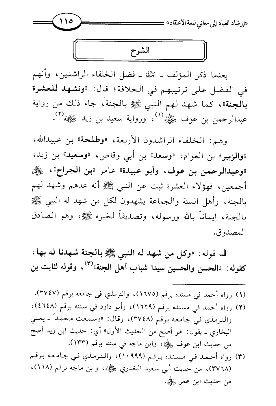 بعدما ذكر المؤلف -رحمه الله- فضل الخلفاء الراشدين، وأنهم في الفضل على ترتيبهم في الخلافة؛ قال: ((ونشهد للعشرة بالجنة))، كما شهد لهم النبي - صلى الله عليه وسلم - بالجنة، جاء ذلك من رواية عبدالرحمن بن عوف - رضي الله عنه - (¬1)، ورواية سعيد بن زيد - رضي الله عنه - (¬2).