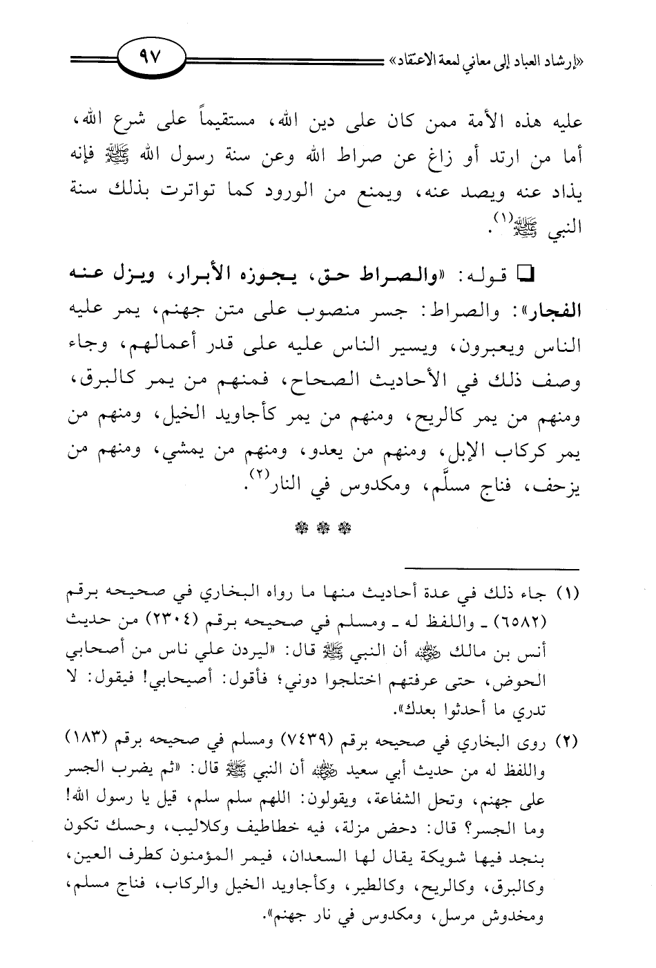 (¬2) روى البخاري في صحيحه برقم (7439) ومسلم في صحيحه برقم (183) واللفظ له من حديث أبي سعيد - رضي الله عنه - أن النبي - صلى الله عليه وسلم - قال: ((ثم يضرب الجسر على جهنم، وتحل الشفاعة، ويقولون: اللهم سلم سلم، قيل يا رسول الله! وما لالجسر؟ قال: دحض مزلة، فيه خطاطيف وكلاليب، وحسك تكون بنجد فيها شويكة يقال لها السعدان، فيمر المؤمنون كطرف العين، وكالبرق، وكالريح، وكالطير، وكأجاويد الخيل والركاب، فناج مسلم، ومخدوش مرسل، ومكدوس في نار جهنم)).